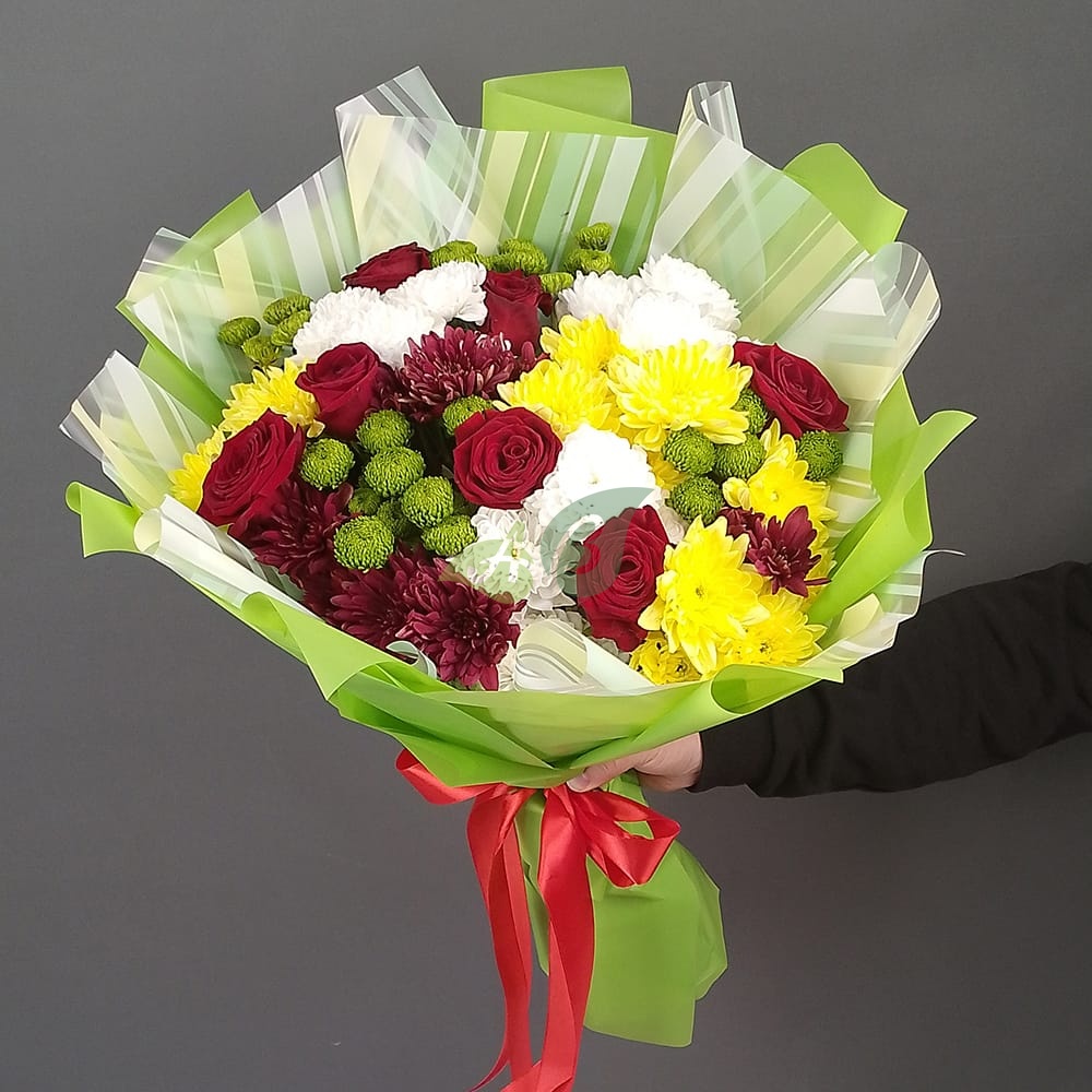 Сборный букет цветов 7 роз и хризантемы